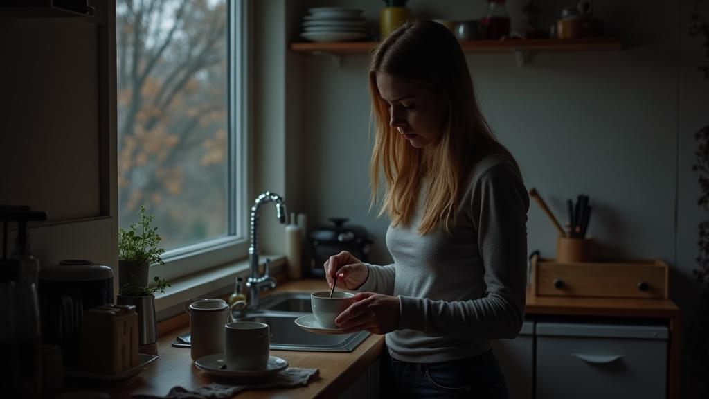 Кухня тонула в полумраке осеннего вечера. Наталья сидела за столом, механически помешивая давно остывший чай. Металлическая ложечка тихо позвякивала о фарфоровые стенки чашки – единственный звук, нарушавший гнетущую тишину квартиры.