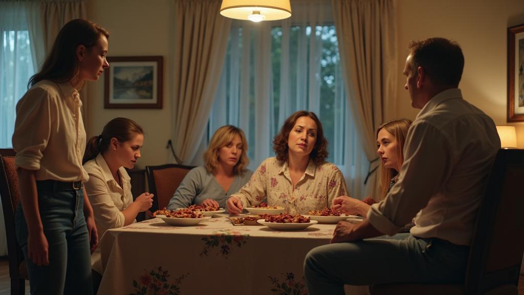 Все взгляды перешли к Олегу, который сидел, сжимая в руке вилку, не в силах поднять глаза. Он смотрел в тарелку, и молчание растягивалось, как туман.