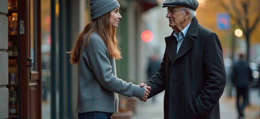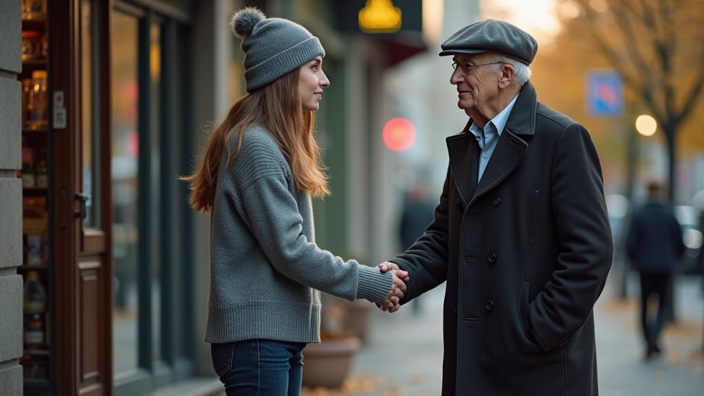 Перед входом в магазин я заметила его: пожилого мужчину в тёмном плаще и сером берете. Он сделал неловкий шаг, зацепился за край ступеньки и резко пошатнулся вперёд. Я подскочила, схватив его за локоть, удерживая от падения.