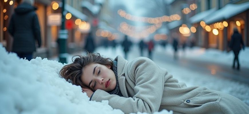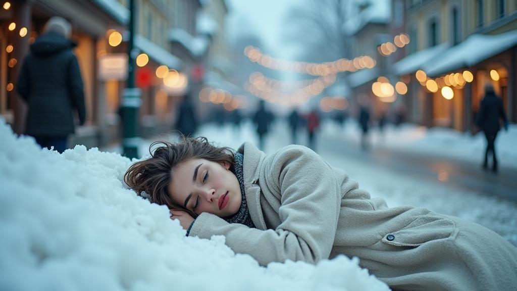 Она лежала в сугробе на окраине главной площади. Снег облепил её волосы, лицо побледнело от холода, глаза были закрыты. Её лёгкое дыхание почти терялось в морозном воздухе. Прохожие, занятые своими делами, проходили мимо, не замечая её. Кто-то украдкой смотрел, но не останавливался.