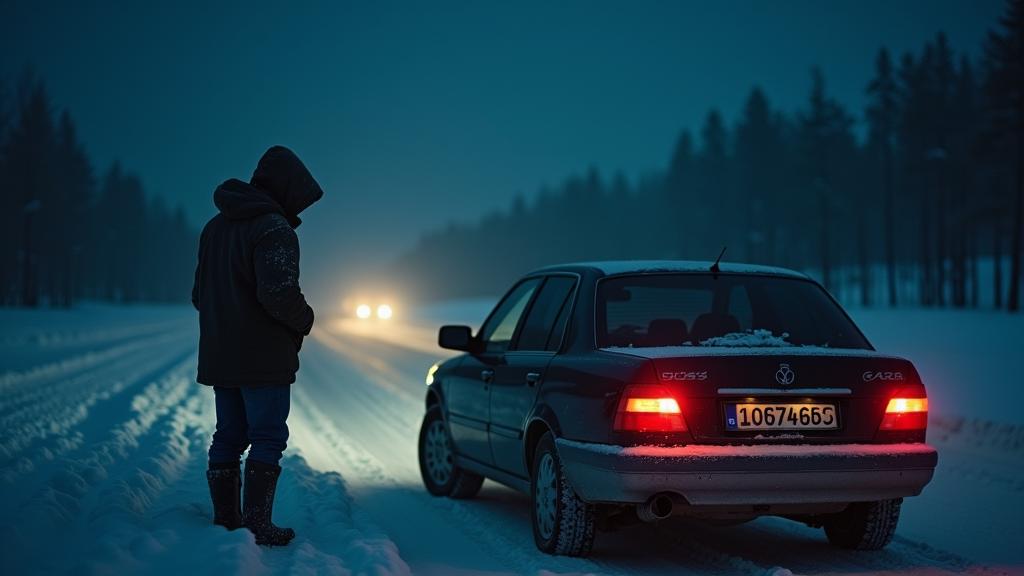 Артём застрял на трассе. Телефон разряжен, на улице снег валит хлопьями, да ещё и время позднее — почти полночь. Машина заглохла и отказалась заводиться на полпути к дому, а ближайший город километрах в двадцати. Он вылез из салона, хлопнул дверью и, выругавшись, пнул колесо.