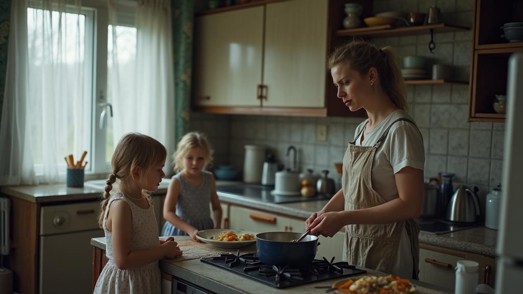 Виктория, стоя у плиты в крошечной кухне хрущевки, вздохнула. Она одновременно помешивала гречку, гладила форму сына-семиклассника и пыталась найти второй розовый бант для дочери. За окном лил осенний дождь, а на часах было 7:15 — до начала её совещания оставалось сорок минут.