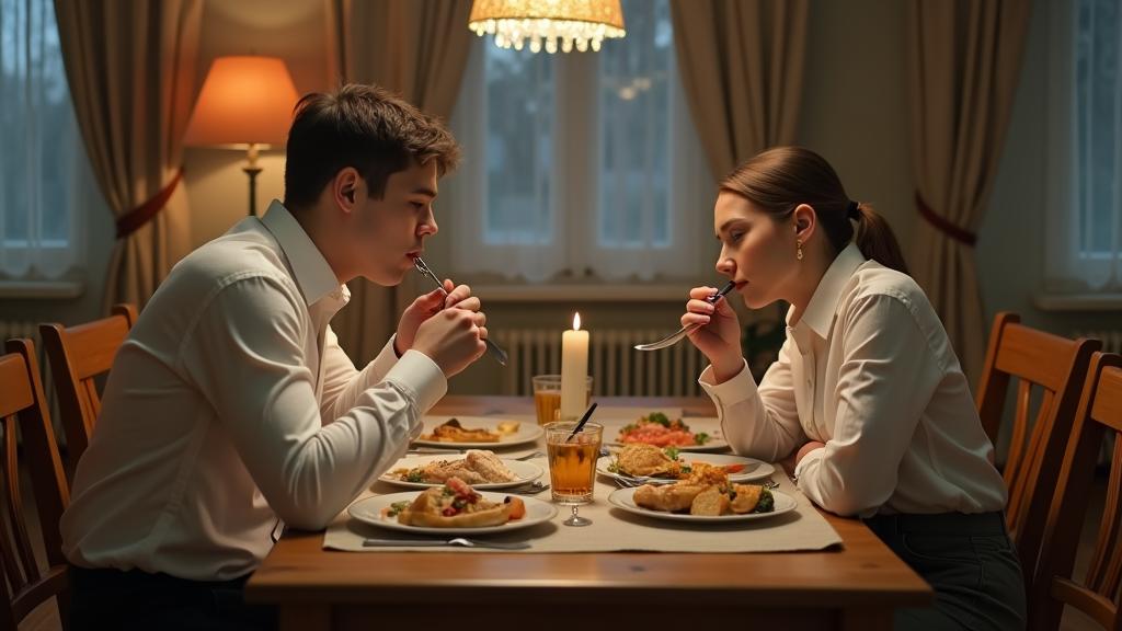 Молодые люди отправились на кухню, чтобы поеть. Стася приготовила “макароны по-флотски” и пока Андрей ел, нахваливал блюдо, как самый изысканный деликатес: