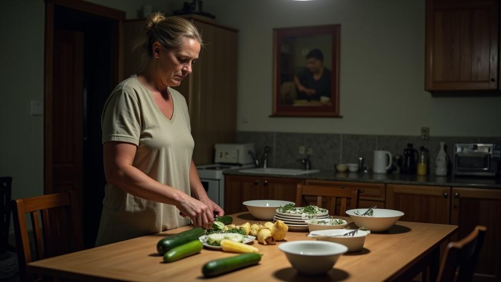 Ольга резала салат с таким остервенением, будто это был не огурец, а шея кого-то весьма конкретного. Стол был накрыт почти торжественно — хрустальная ваза с мандаринами, фарфоровый сервиз, который Сергей когда-то всучил ей на годовщину с видом «держи, ты ж женщина». Сама она была в мягком домашнем трикотаже, волосы собраны в пучок — типичная хозяйка, которая к шести готовит ужин, к семи морально готова к унижению.