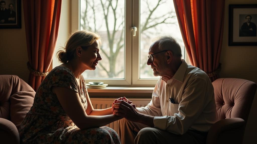 В просторной гостиной стояла старая мебель, хранившая память о счастливых днях. Тяжёлые бархатные шторы приглушали дневной свет, создавая уютный полумрак. На стенах висели пожелтевшие от времени фотографии, молчаливо хранившие историю семьи.