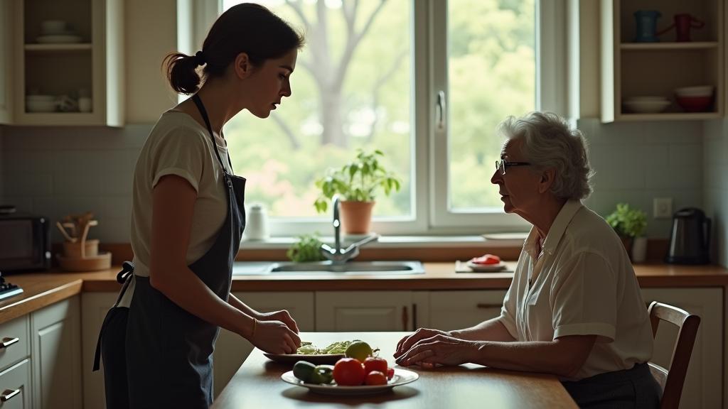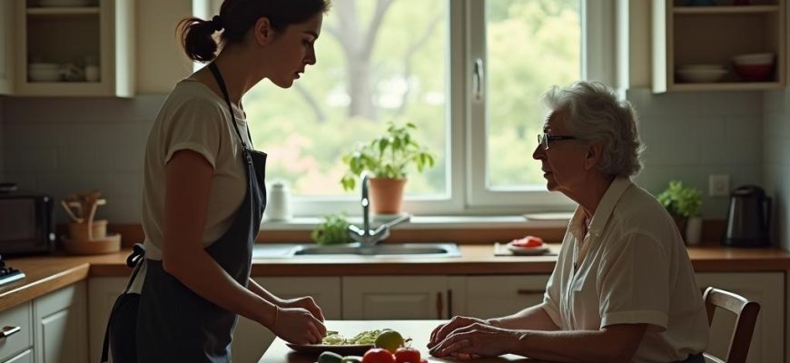 Невестка вздрогнула, едва не порезав палец. Она медленно подняла взгляд от разделочной доски, где аккуратными рядами лежали нарезанные овощи. Её тёмно-карие глаза встретились с холодным взором свекрови.