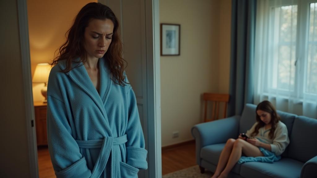 Татьяна стояла в дверном проёме, придерживая ворот синего махрового халата. Капли воды стекали с мокрых волос на плечи и впитывались в ткань. Она только что вышла из ванной и застала будущую родственницу с собственным смартфоном в руках. Оля сидела на диване и с любопытством листала экраны телефона.