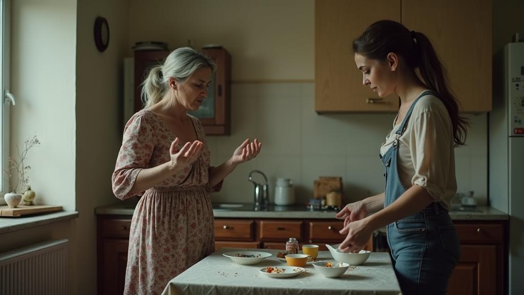 На кухне повисла тяжёлая тишина, нарушаемая лишь монотонным тиканьем старых настенных часов да шумом дождя за окном. Старая занавеска чуть колыхалась от сквозняка, а на подоконнике мирно дремал полосатый кот, безразличный к семейным неурядицам.