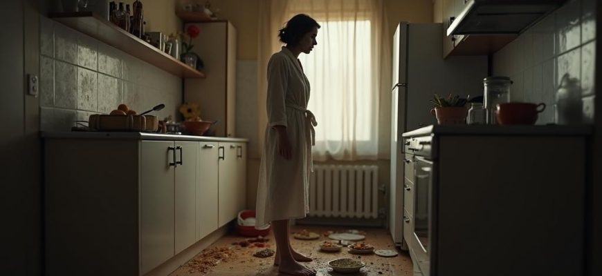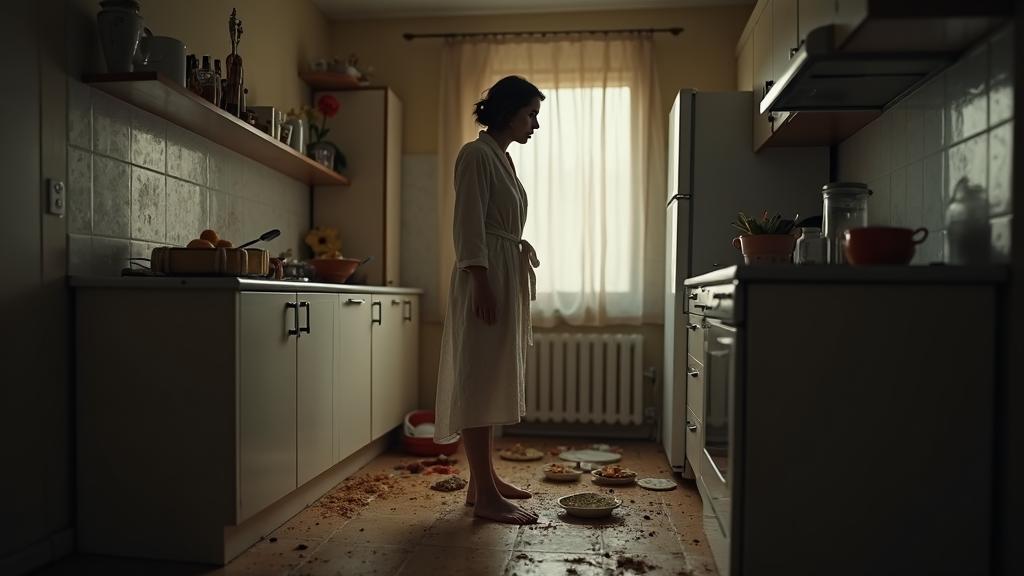 Кухня была как после карнавала в гастрономе. На столе — банка с остатками майонеза, горчица, рваный пакет, тарелки с облипшими вилками. Пол в крошках и пятнах. Плитка залита жиром.