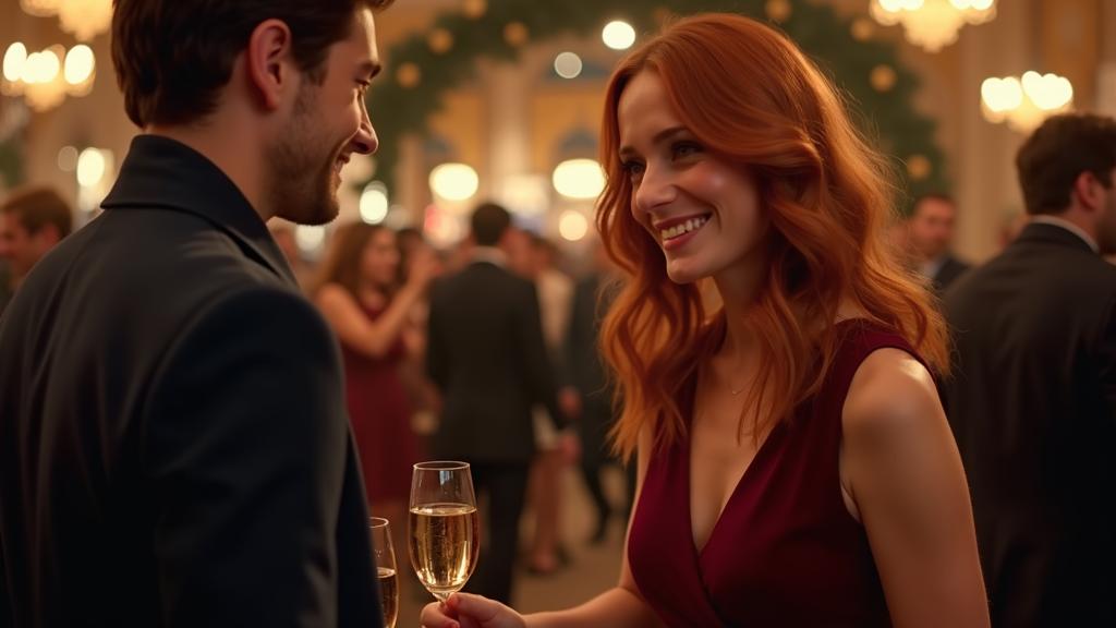 Вероника надела свое любимое бордовое платье, подчеркивающее рыжий цвет волос, и лаковые туфли на небольшом каблуке. Вход в ресторан, где проходил корпоратив, встретил ее шумом смеха, звоном бокалов и запахом хвои. Вероника улыбнулась — атмосфера праздника витала в воздухе.