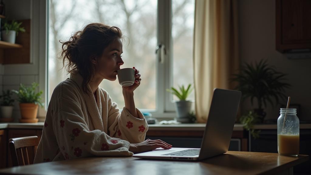 Оксана сидела на кухне в старом домашнем халате с цветочным принтом, потягивая ароматный кофе и наслаждаясь редкой тишиной в квартире. За окном моросил осенний дождь, стекая по стеклу мелкими дорожками. На столе лежал раскрытый ноутбук — она планировала поработать над проектом в спокойной обстановке, без отвлечений и суеты.