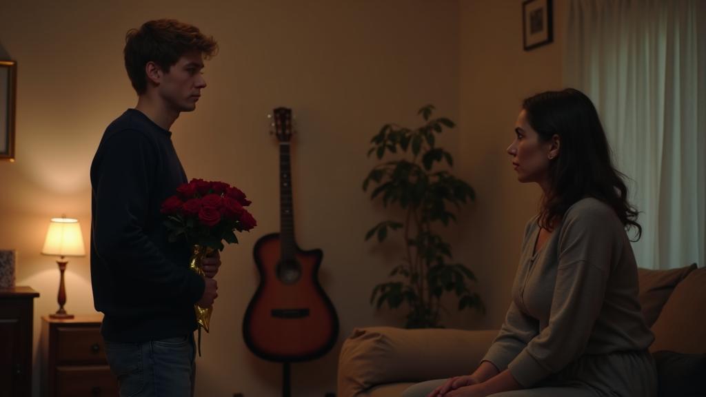 — Ты серьезно, Лера? Прямо сейчас? — голос Антона дрожал. Он стоял посреди гостиной, сжимая в руках букет алых роз, перевязанный золотистой лентой. На столе за его спиной мерцали свечи, отбрасывая теплые отблески на стены, а в углу комнаты тихо играла музыка — что-то медленное, с гитарными переборами.