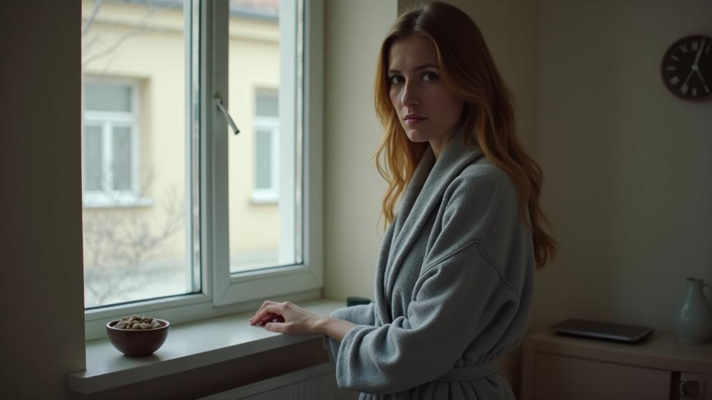 Анастасия, всё такая же собранная, как на собеседовании в консульстве, стояла у окна, обёрнутая в свой серый халат, с которого начиналась её территория. Этим халатом она будто заявляла: «Это моя квартира, мой холл, мои окна в мир, и никому тут не хозяйничать!»