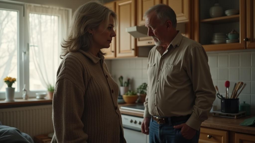 Утро в городской квартире. На кухне завтракает муж. Жена, с огромным животом на последнем месяце беременности, сидит рядом и пьёт сок.