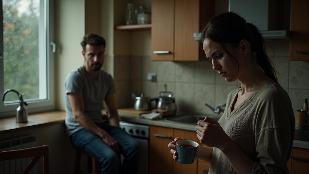 Артём вздохнул и сел на стул, будто ноги перестали его держать. За окном шёл мелкий дождь, и капли тихо стучали по стеклу, создавая фон для их напряжённого разговора.