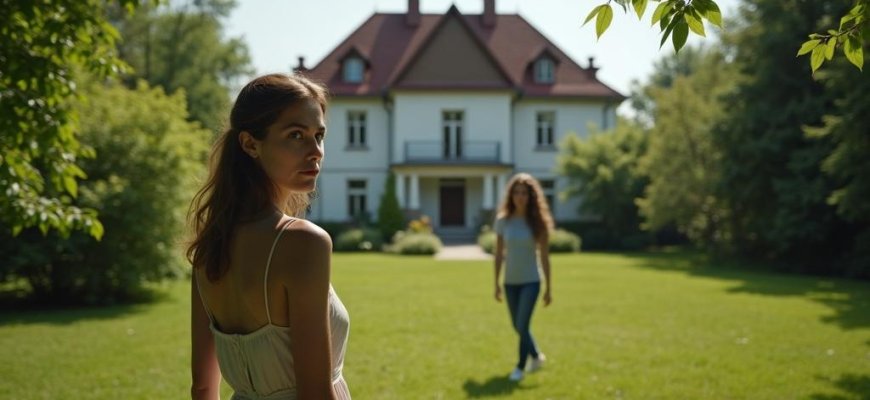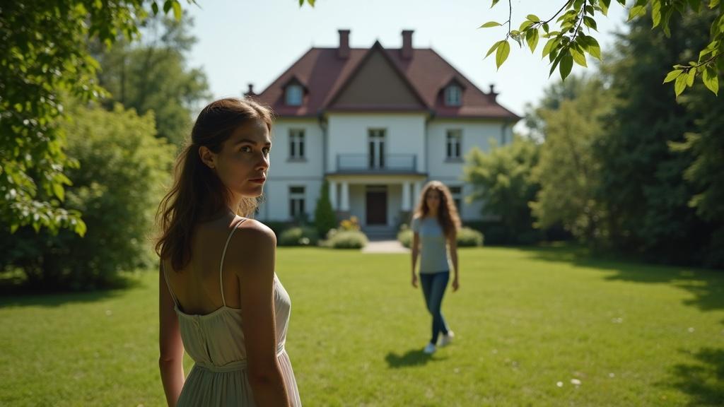 Наследницы загородного двухэтажного дома громко засмеялись и вдруг увидели на дорожке огромного пса породы овчарка. Пес наклонил голову набок и с интересом смотрел на незнакомок.