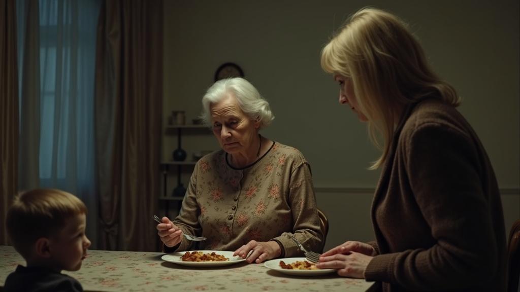 Мой сын Алексей продолжал есть, не поднимая головы. Ни слова в мою защиту, ни возражения, даже взгляда в мою сторону. Его молчание кричало громче её выпада. Внук смотрел растерянно — слишком мал, чтобы понять всё, но достаточно взрослый, чтобы почувствовать тяжесть взрослого гнева.