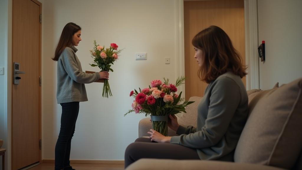 – Я ничего не заказывала, – ответила Наталья. Но курьер назвал Наталью по имени, пришлось открыть дверь. Курьер принёс красивый букет. В букете записка и коробочка с кольцом. Наталья ещё раз спросила у курьера: