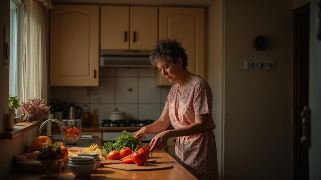 Тётя Галя недолго думая уселась за стол и принялась уплетать копчёную колбасу.