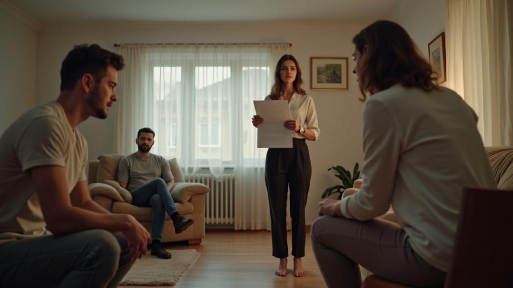 Людмила Павловна сидела напротив, скрестив руки на груди, её губы были сжаты в тонкую линию. Рядом с ней, словно тень, маячил Андрей — муж Марины, который старательно избегал её взгляда.