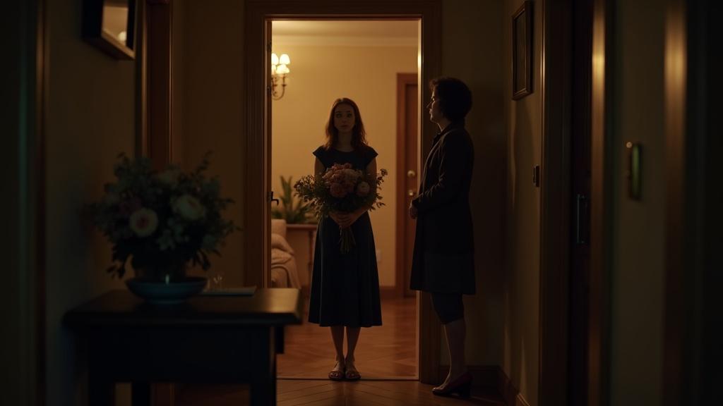 Мария застыла на месте, держа в руках тщательно выбранный букет пионов. Галина Ивановна стояла в дверях, окидывая её оценивающим взглядом с головы до ног. В этом взгляде читалось всё — от презрения до откровенной враждебности.