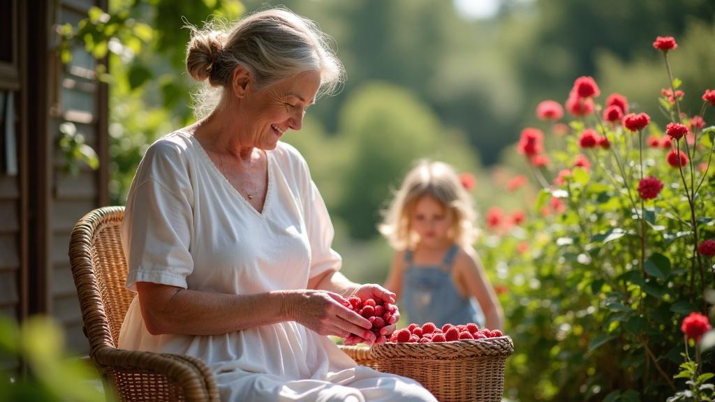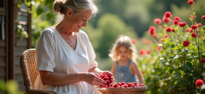 Надежда Сергеевна сидела в старом плетёном кресле на веранде, неторопливо перебирая малину, собранную на рассвете, когда роса ещё искрилась на листьях. Каждая ягода — тёмно-рубиновая, налитая сладким соком — ложилась в глиняную миску с еле слышным стуком. Июньское солнце затейливо пробивалось сквозь резную листву яблонь, разбрасывая по выцветшим доскам веранды причудливые узоры теней и света.