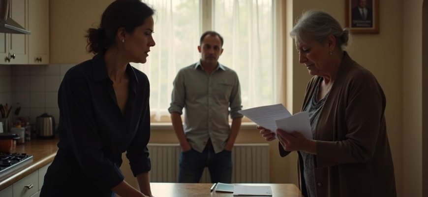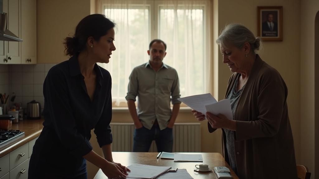 Галина Петровна стояла в дверях кухни, держа в руках какие-то бумаги, а за её спиной виднелся Павел — муж Татьяны, который явно знал о визите матери заранее, но ничего не сказал жене.