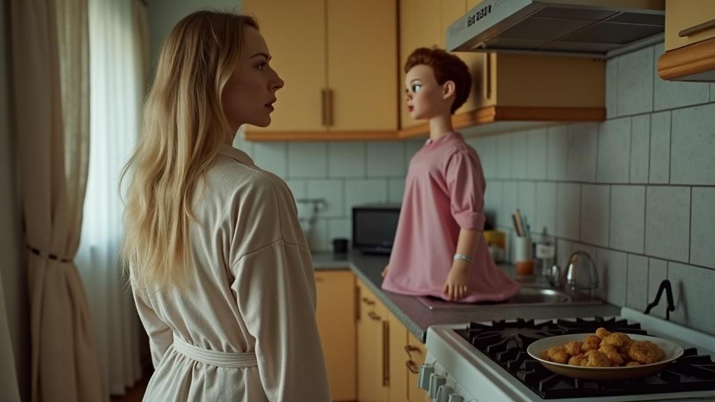 — Ты с ума сошёл? Это ведь надувная кукла? Как она может жарить котлеты? Ты её где взял?