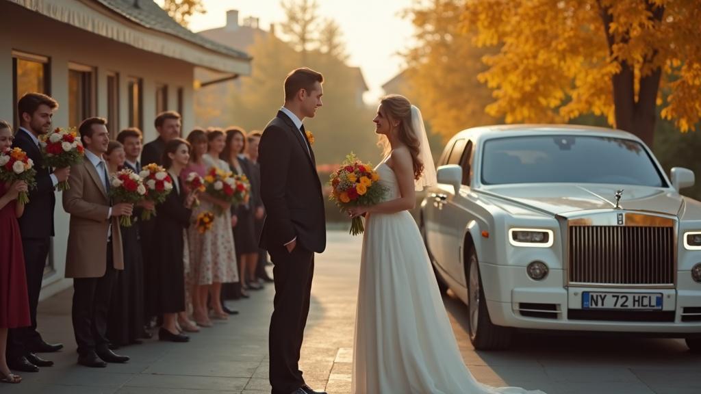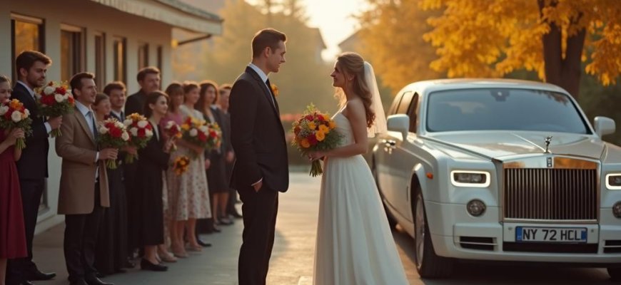 Золотая осень — пора свадеб. К входу в ЗАГС подъехал белый Лимузин. Его окружает толпа нарядных гостей с цветами. Прибыли жених и невеста.