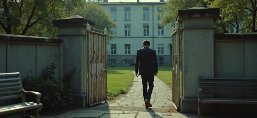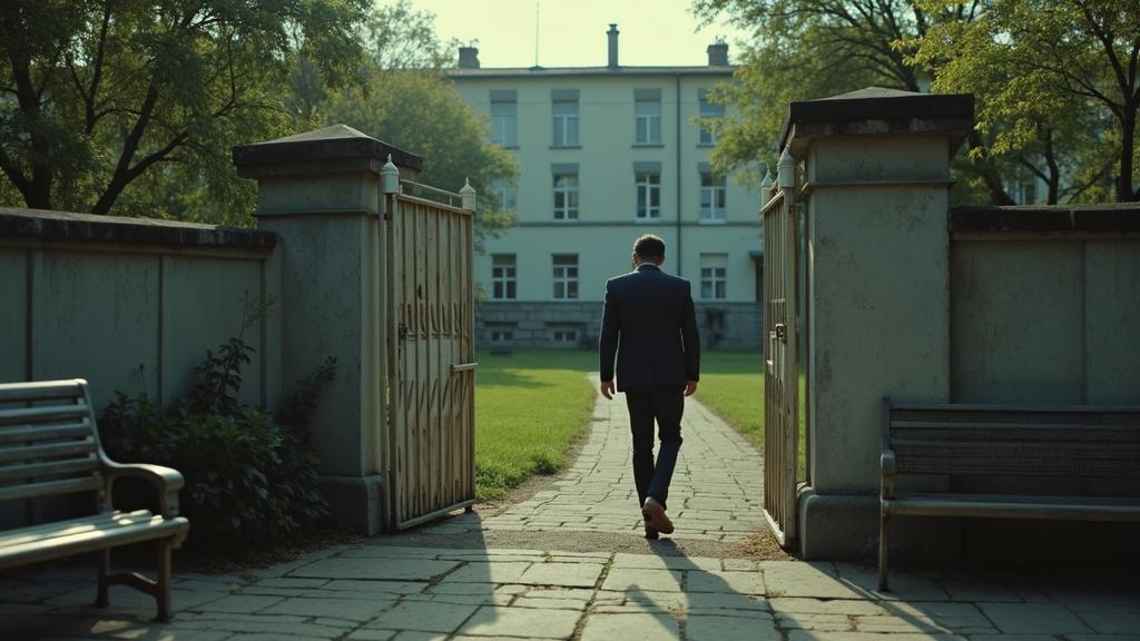 С высокого крыльца спускается мужчина неопределённого возраста в костюме. Он очень худой, с отёкшим лицом и мутным взглядом. В этом уставшем от жизни человеке едва можно узнать ещё год назад жизнерадостного двадцатилетнего Михаила. Его провожает до ворот солидный охранник. Брякая ключами, он открывает их и выпускает бывшего пациента.