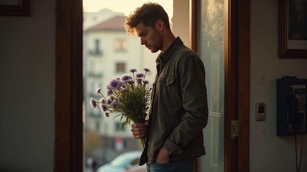Топчется ещё какое-то время, теребя ремешок часов на руке, и вздыхает. Наконец, глубоко, выдохнул, опустив цветы, как саблю у ноги и сорвался с места. Нервно помахивая букетом, словно авоськой, быстро направляется к телефону автомату. Уже в кабинке, шаря по карманам, в поисках «двушки», обернулся в сторону проходной – её нет.