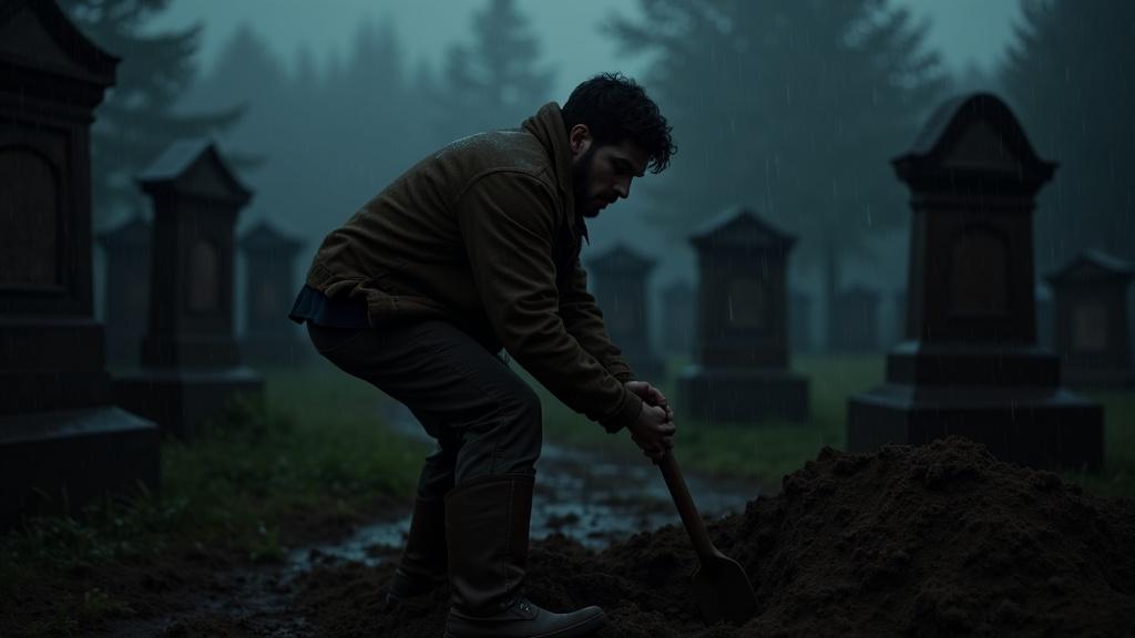 Было это лет пятьдесят назад. Вечером бригада землекопов рыла очередную могилу для нового поселенца, которого должны хоронить на следующий день утром. Могила была почти закончена, как пошёл небольшой дождик, и бригадир сказал, чтобы всем не мокнуть, то пусть останется один Петруха, а все идут в сторожку. Дел оставалось немного: подравнять и подчистить дно могилки, а выбор Петрухи объяснялся тем, что он был самым молодым и работал в бригаде недавно, поэтому обычно исполнял роль «салаги».