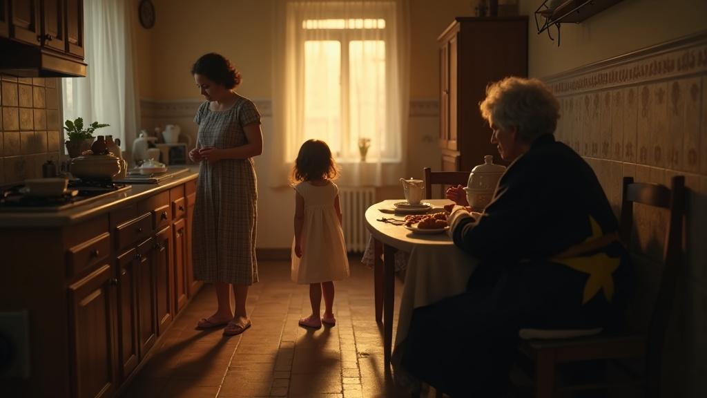 Ниночка не ошиблась: мама, в фартуке в красно-белую клетку поверх домашнего халата, вынимала из духовки противень. Пирожки получились все, как на подбор, круглые и румяные. Какая же в них начинка? Тушёная капуста? Рубленное яйцо с рисом? Ой, малиновое варенье? Так не терпелось попробовать, и девочка уже собиралась подбежать к маме и поцеловать, но вдруг остановилась, как вкопанная, увидев, что мама в кухне не одна. За столом сидела женщина, которую Ниночка никогда раньше не видела: у неё были грустные глаза и тёмные с проседью волосы, а на потрёпанное чёрное старомодное пальто была нашита жёлтая шестиконечная звёздочка. Лицо у незнакомки было худое и бледное, и она смотрела на пирожки жадным голодным взглядом.
