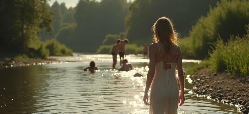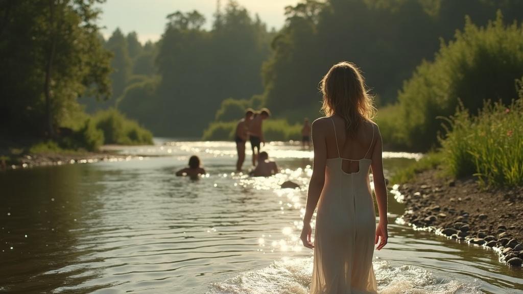 Плавает с наслаждением минут двадцать. А в это время на берегу остановилась красная спортивная машина и вышли двое. Парни, возвращаясь с ночной вечеринки тоже решили искупнуться. Увидели лесную нимфу. Крадутся к ней ближе. Один заметил её сарафан и, тыча в него пальцем, хихикает.