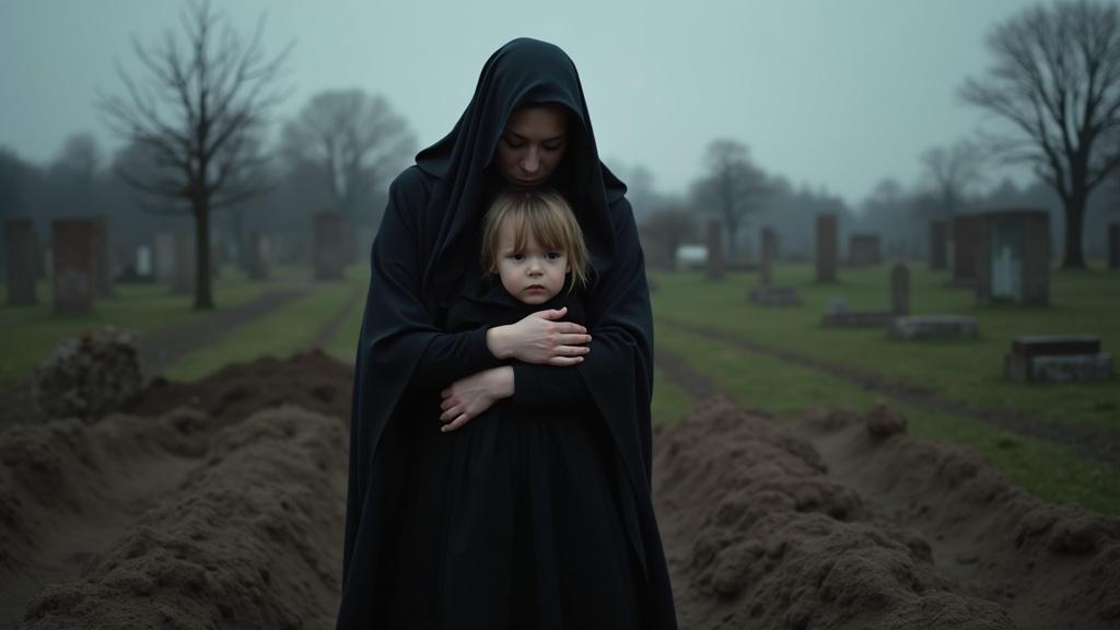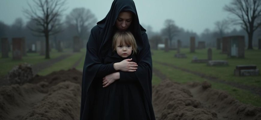 Хмурый осенний день на деревенском кладбище. Очередные похороны скоропостижно умершего односельчанина. Женский плач. Вдова, прижимая к себе малолетних детей, стоит молча. Только качается от горя.
