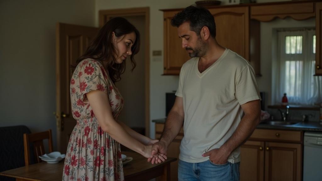 Женщина подошла к мужу, коснулась его спины, а затем обняла и, чтобы успокоить, стала гладить его по груди.