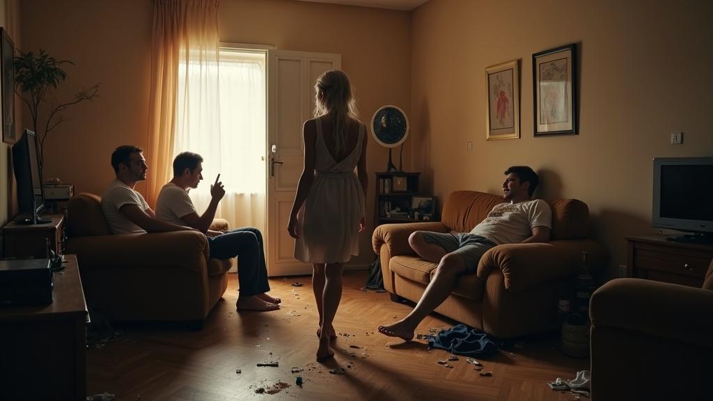 Ольга шагнула вперед, и картина окончательно сложилась: ее диван был завален людьми, на столе — бутылки, закуска, пепельницы с окурками. В центре — ее сестра Катя, с сигаретой в одной руке и бокалом в другой.