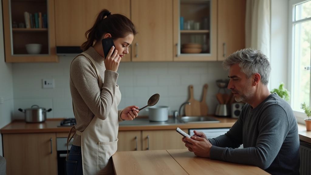 Надежда замерла с телефоном у уха. Кровь прилила к щекам. Она стояла на кухне своей квартиры, в руке держала половник, готовясь разлить суп по тарелкам. За столом сидел Пётр, уткнувшийся в телефон. Он даже не поднял головы.