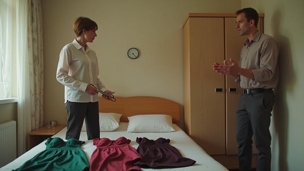 Она стояла посреди спальни, держа в руках портновские ножницы, и смотрела на него с таким спокойствием, которое могло напугать кого угодно. На кровати лежали три дорогих платья — бордовое, изумрудное и то самое, коктейльное, которое он купил ей на годовщину. Все три были аккуратно, методично разрезаны пополам. Не порваны в приступе истерики, а именно разрезаны — ровными, целенаправленными движениями.