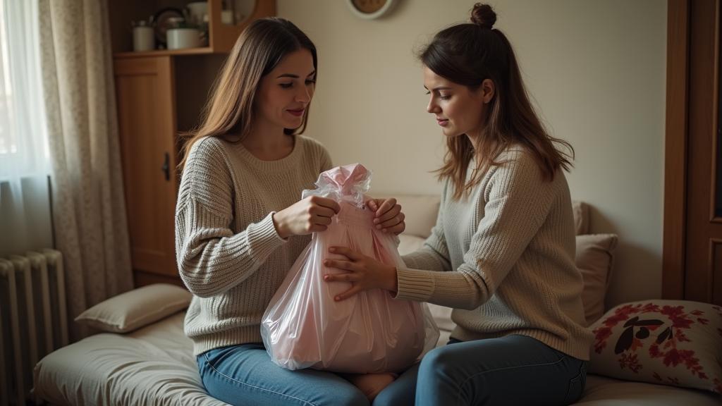 — Бери, Маш, ну что ты? Нет, конечно, — заверила знакомую Анжела, и стала помогать ей, упаковывать детский комбинезон в пакет.