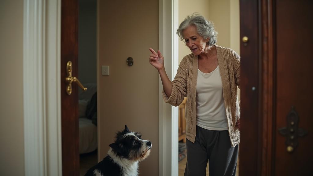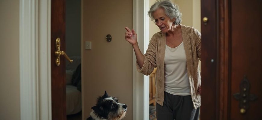 Пожилая женщина открыла дверь подъезда настежь и попыталась выманить пса.