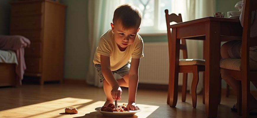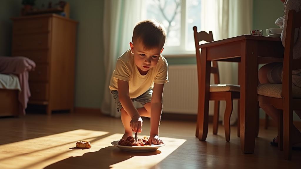 Мальчик хитро прищурился, глядя на бабушку, которая строго смотрела на него из комнаты и вместо того, чтобы поднять, незаметно пнул кусочек хлеба ещё дальше под стол.