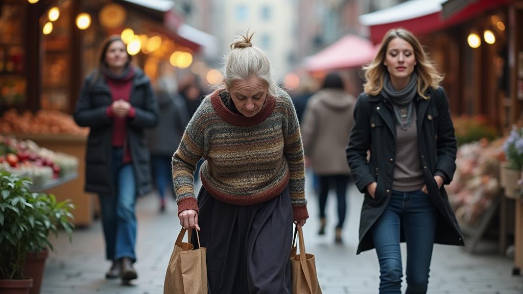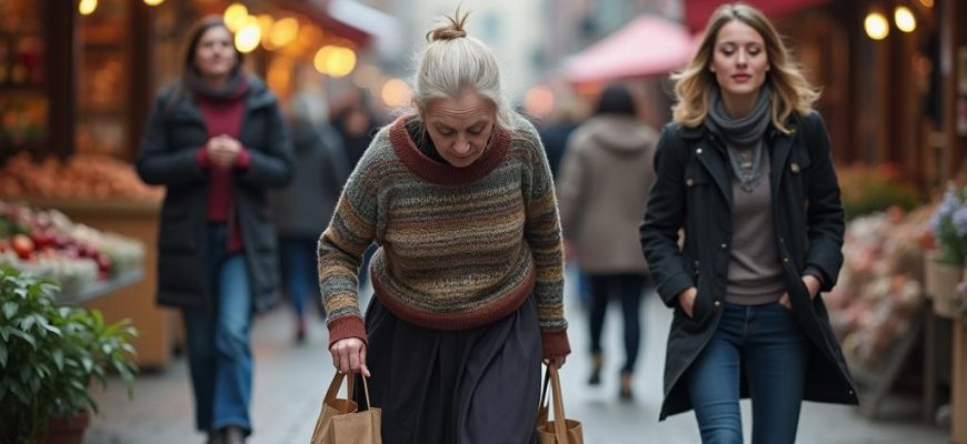 Впереди очень медленно, опустив голову, охая и вздыхая, сгибаясь под тяжестью внушительной сумки, шла какая-то женщина. Было очевидно, что каждый шаг дается ей с огромным трудом.