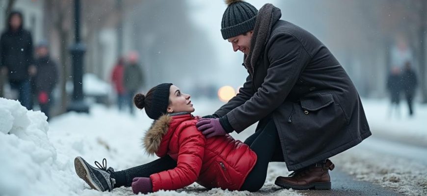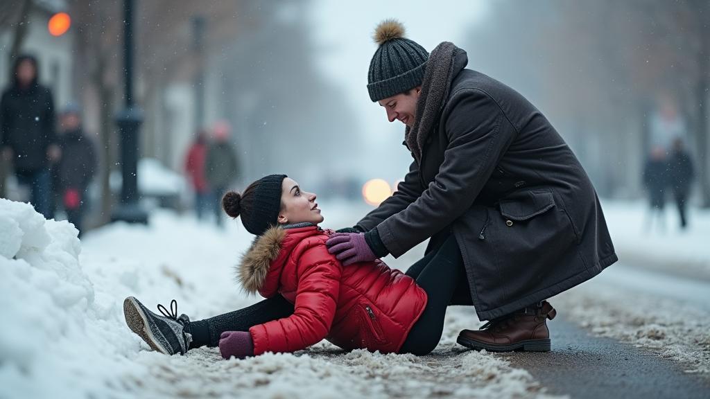 Поднял пострадавшую, отряхнул ее пуховик, старательно очистил от соленой грязи сумку и все повторял: