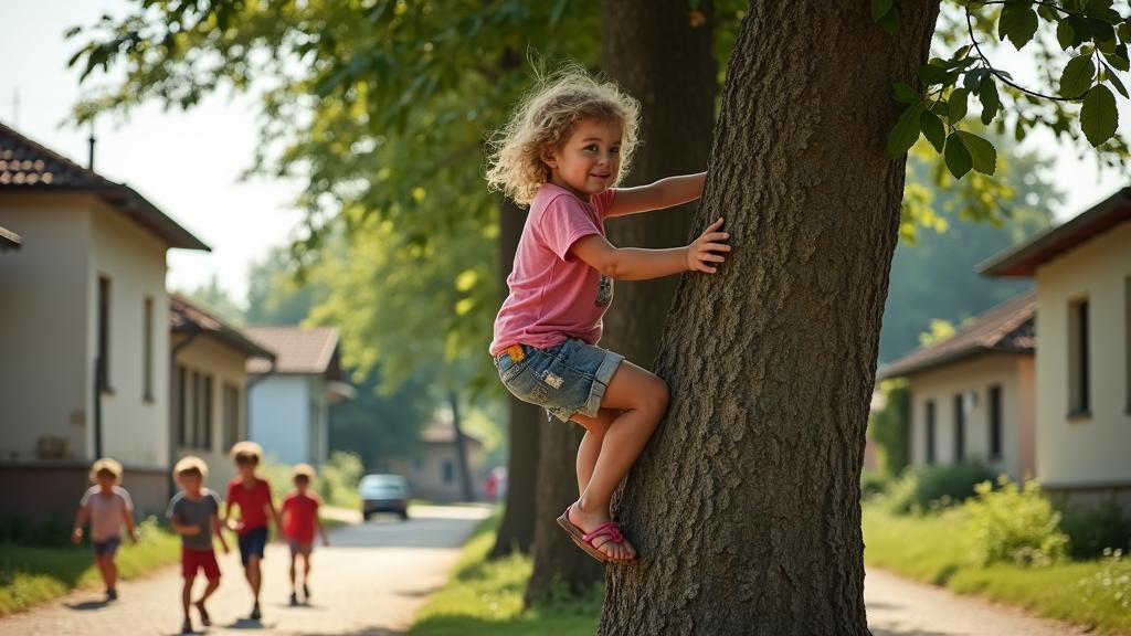 Надо сказать, у нее это неплохо получалось. Вместе с мальчишками, она ловко лазила по деревьям, играла в «казаков-разбойников», участвовала в набегах на дачные участки, как только появлялись первые яблоки. Она даже стояла в воротах, когда мальчишки играли в футбол! Настолько они ей доверяли.