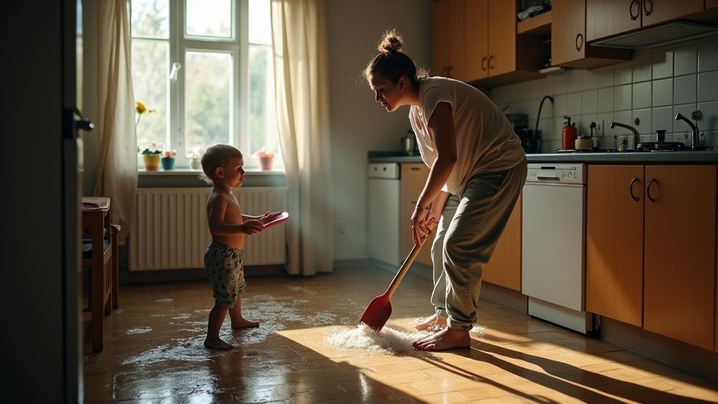 К огромному облегчению Захара, ни почти трёхлетний Максим, ни Катя не пострадали. Однако недавно отремонтированная кухня, гордость и любимый уголок хозяйки, была в плачевном состоянии. Потоки воды заливали гарнитур. На полу была вода, грозившая вот-вот перелиться через невысокий порожек. Катя, зачёрпывая её совком, сливала в ведро и сбивчиво объясняла мужу: