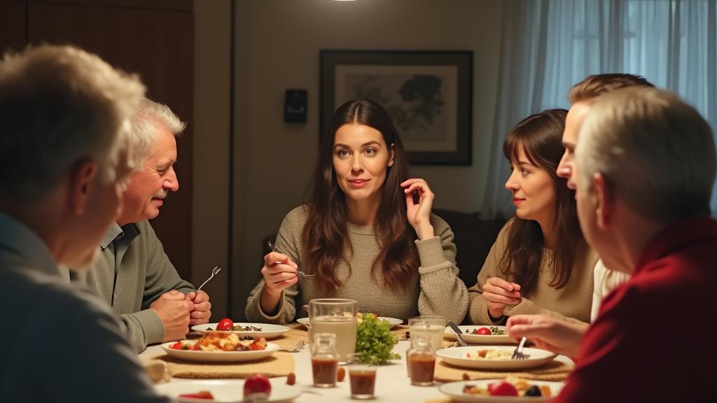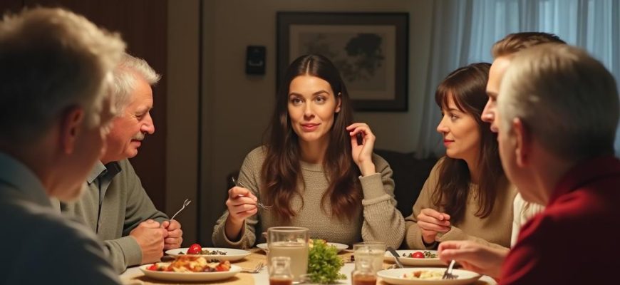 Тяжелый запах жареного мяса и свежей выпечки витал в воздухе, смешиваясь с громкими голосами и звоном бокалов. Марина сидела за большим праздничным столом в доме свекрови, машинально поправляя выбившуюся прядь волос. Рядом шумно обсуждали последние новости родственники мужа – его мать Валентина Петровна, сестра Наташа, двоюродные братья. Казалось бы, обычное семейное застолье, но что-то неуловимо напрягало.