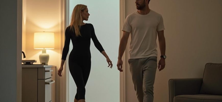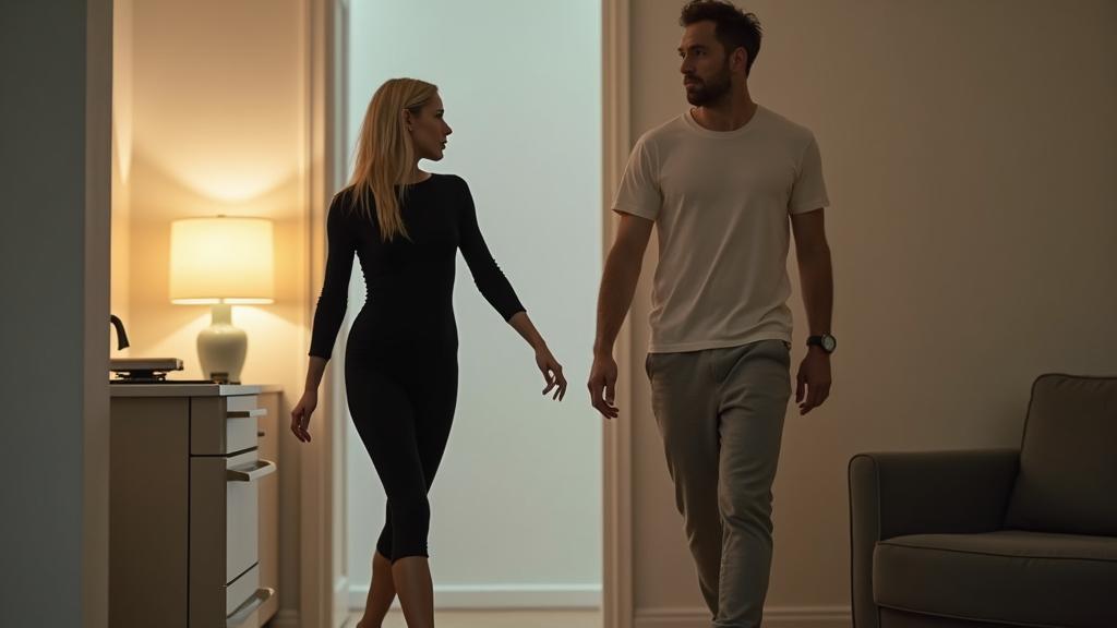 Анна входит первой — быстрые, почти резкие движения выдают её внутреннее напряжение. Туфли — брошены небрежно у входа, браслет — расстёгнут одним точным движением запястья. Она проходит в спальню, даже не взглянув на мужа.