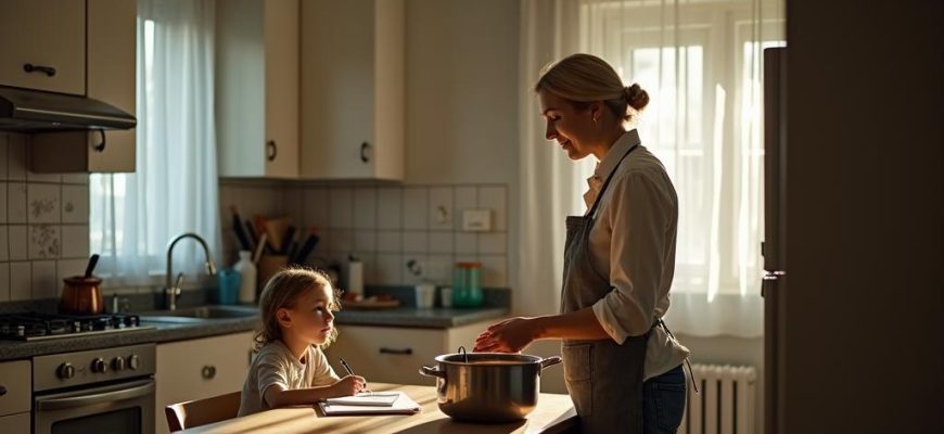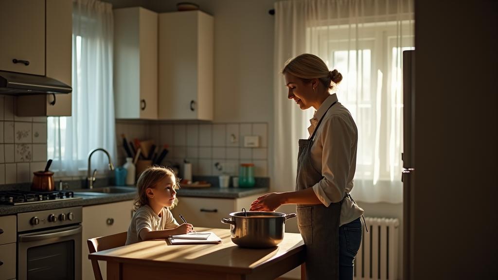 В тот вечер Марина готовила ужин, напевая любимую мелодию. Маленькая Настя сидела за кухонным столом, старательно выводя буквы в прописях, время от времени показывая маме особенно удачные строчки.